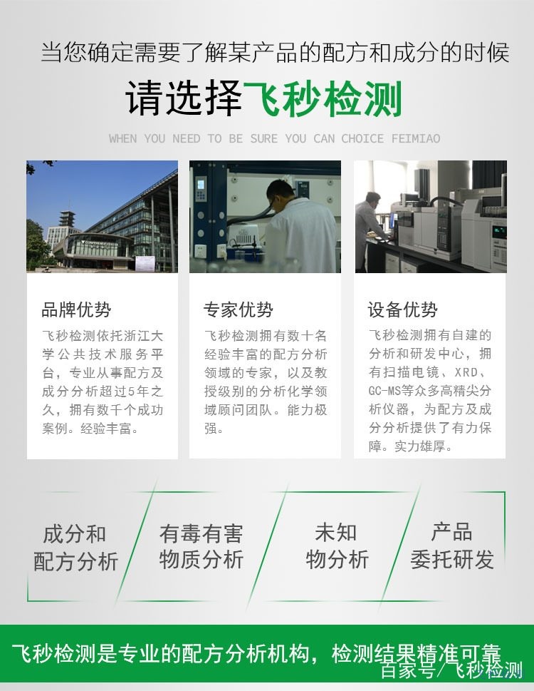 飞秒检测是专业从事成分及配方检测、工艺研发、异物分析、未知物鉴定、工艺诊断的专业公司,配备了完善的分析仪器,例如气质、液相、核磁、高分辨质谱、GPC、红外、紫外、SEM等必要的分析设备,同时具有一只丰富研发经验的团队,可以为用户提供一站式检测、研发服务??梢园俣人阉鳌胺擅爰觳狻被袢∽钚侣痔シ涝喊咐透苫?。